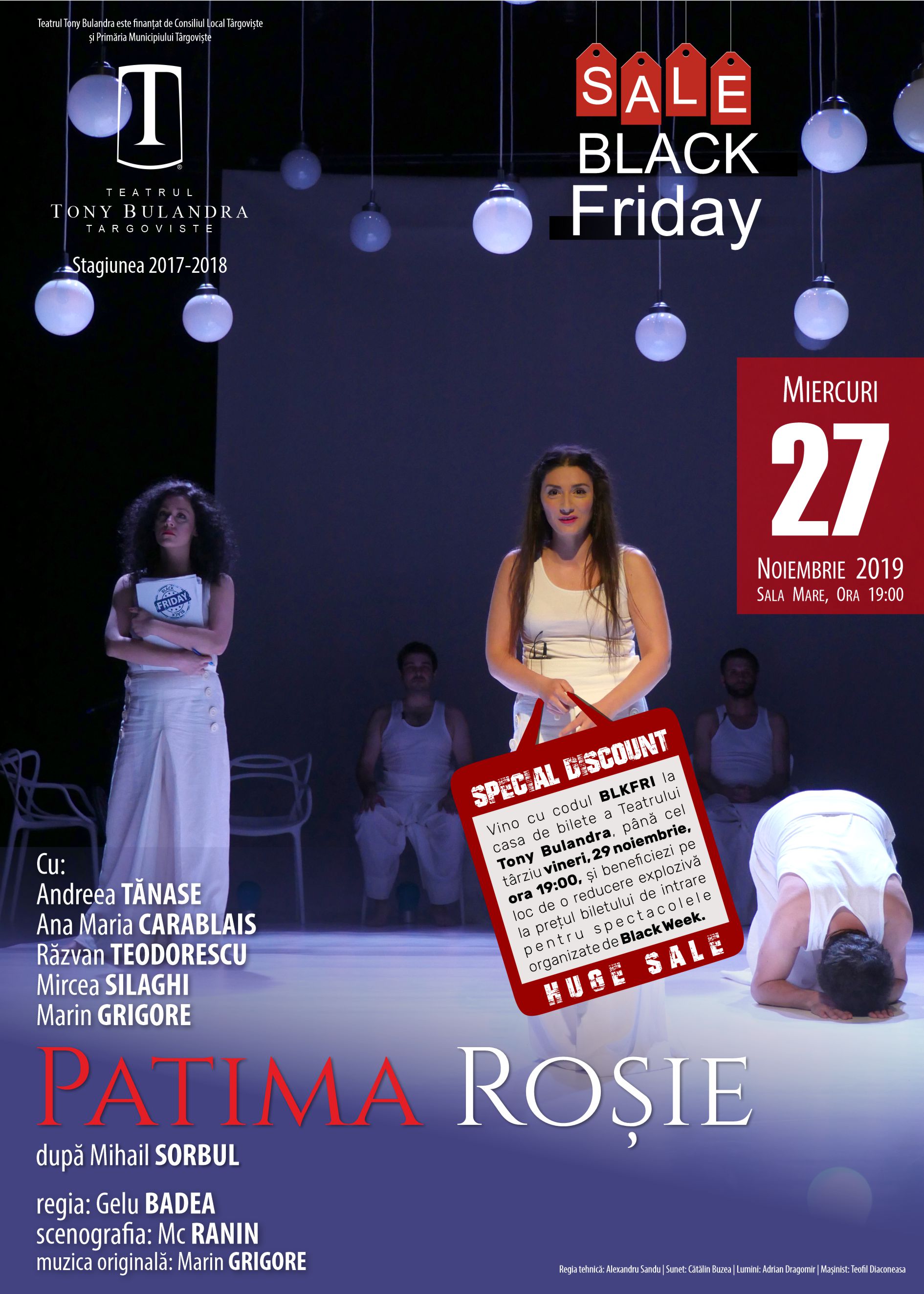 Tot ce ai de făcut, este sa vii până cel târziu vineri, 29 noiembrie, ora 19:00, cu codul: BLKFRI, exclusiv la agenţia de bilete a Teatrului Tony Bulandra, începând cu astăzi, 18.11.2019 și beneficiezi pe loc de o reducere explozivă la prețul biletului de intrare pentru spectacolele organizate de Black Week.”