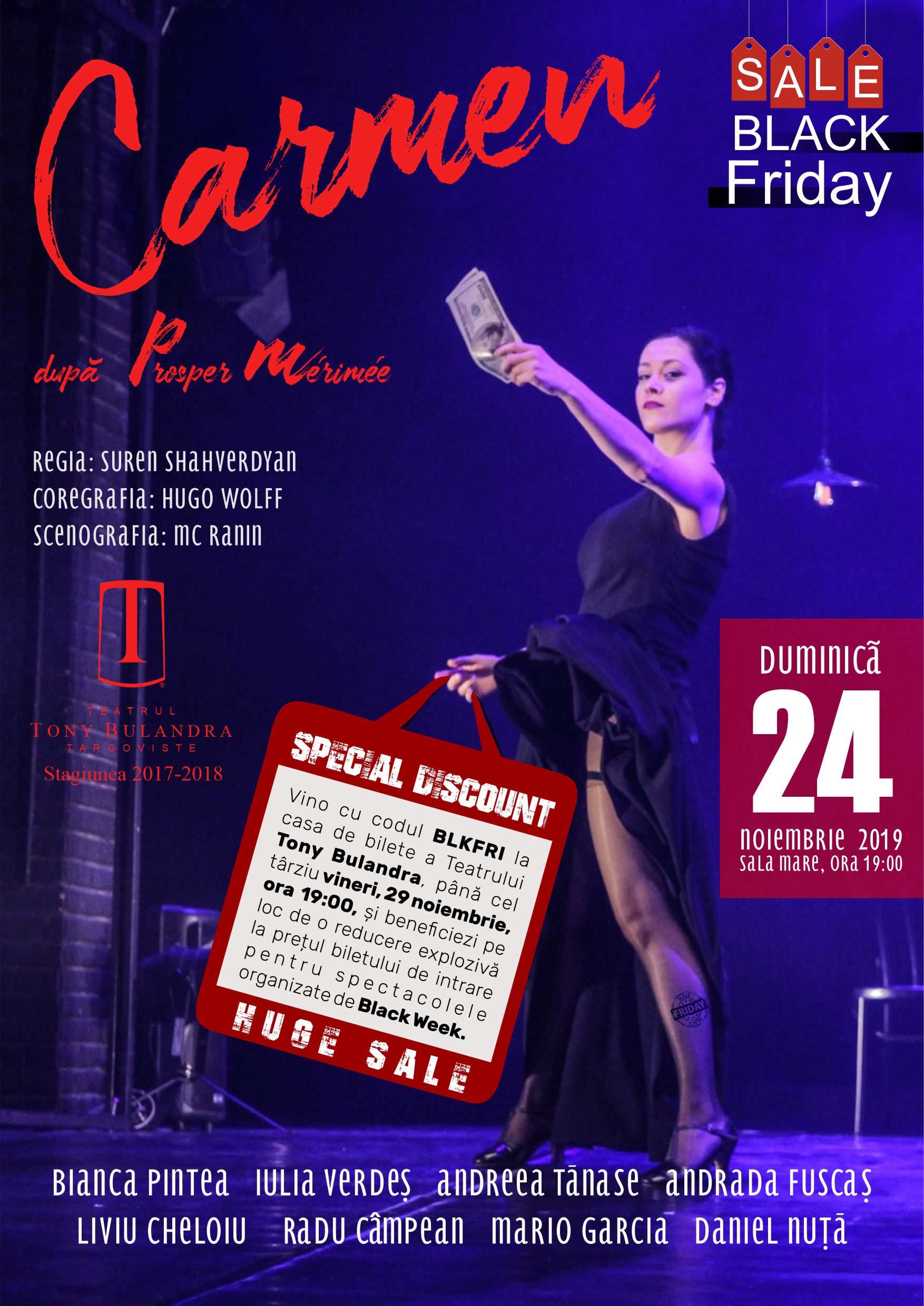 Astfel, începând cu duminică 24 și până vineri 29 noiembrie, inclusiv, îți vom oferi reduceri explozive la prețul biletelor pentru spectacolele: Carmen (24 nov); Patima Roșie (27 nov); Take, Ianke și Cadîr (28 nov); Livada de